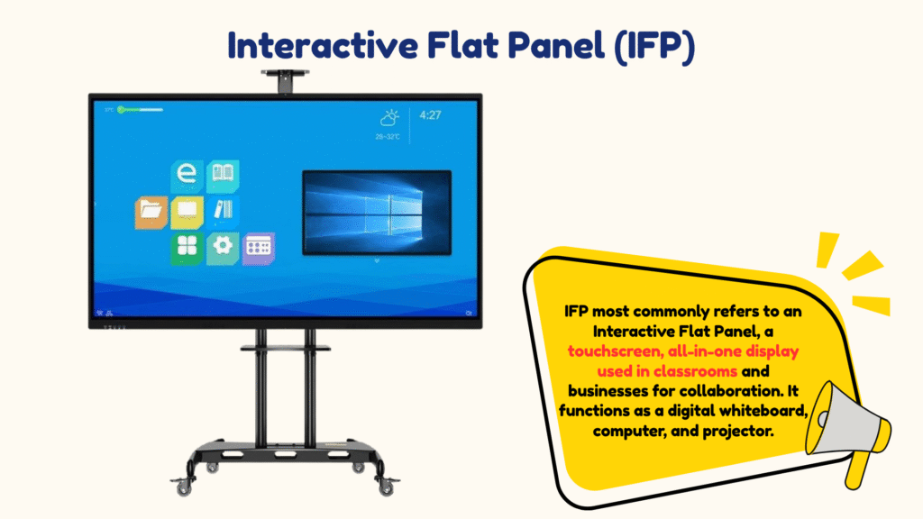 IFP most commonly refers to an Interactive Flat Panel, a touchscreen, all-in-one display used in classrooms and businesses for collaboration. It functions as a digital whiteboard, computer, and projector.