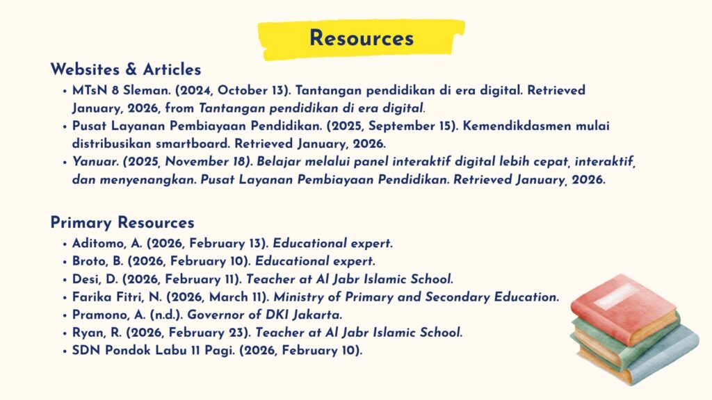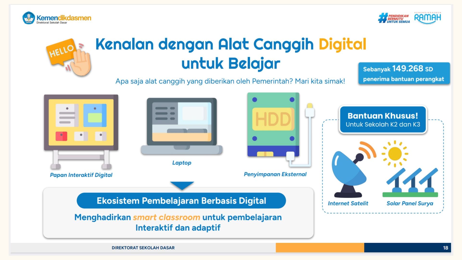 The Indonesian government is actively supporting the digitalization of education by providing advanced learning tools such as interactive digital boards, laptops, and external storage devices. In certain regions, additional support like satellite internet and solar panels ensures that schools in remote areas can also access technology.
